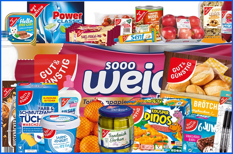 „Die Preiseinstiegsmarke umfasst mehr als 1.400 Produkte aus den Bereichen Lebensmittel und Non-Food. Von Aufbackbrötchen, Toast, Wurst, Butter, Honig und Joghurt für Ihr Frühstück über den Kartoffelsalat zum Grillen bis hin zu GUT&GÜNSTIG Getränken wie Apfelschorle, Wasser und Kaffee finden Sie alles, was Sie für den täglichen Bedarf benötigen – dauerhaft niedrig im Preis!“, so schreibt es die EDEKA.