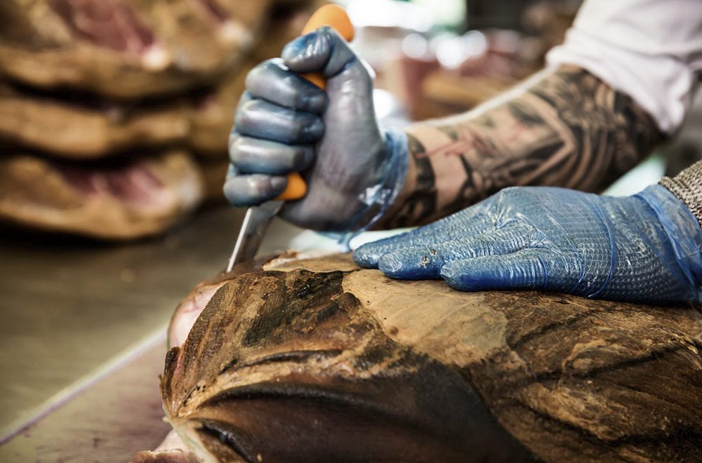 Mit Leidenschaft für die Produkte arbeitet Inhaber Henning Basedahl mit seinem Team aus kompetenten Mitarbeitern in Hollenstedt an den ganz besonderen Schinken, die hauchdünn auf rustikalem Landbrot, zu einem Glas Wein oder einem kräftigen Bier und gerade jetzt zum Spargel im Frühling so fantastisch schmecken. „Man sagt, dass in der Ruhe die Kraft liegt. Aber auch der Geschmack“, sagt Henning Basedahl und geht getreu diesem Motto ans Werk. Alles beginnt bei der Fleischqualität, welche die Güte des Endproduktes bestimmt. Die Manufaktur bedient sich dabei deutscher und dänischer Sauen mit guter Fettverteilung für Geschmack, Farbe, Festigkeit und Form. Jeder weitere Schritt – so sagt es das Prädikat Manufaktur – erfolgt liebevoll und traditionell von Hand. Die Stücke werden mit feinstem Luisenhaller Tiefensalz aus Göttingen, welches für seine Reinheit geschätzt wird, gesalzen und acht bis zehn Wochen gewendet. Im Anschluss geht es in die 40 Jahre alten Räucherkammern, die zur Gründung 1975 von Henning Basedahls Vater errichtet wurden. In dichtem Rauch von Buchenrundholzspänen aus nachhaltiger Forstwirtschaft reifen die