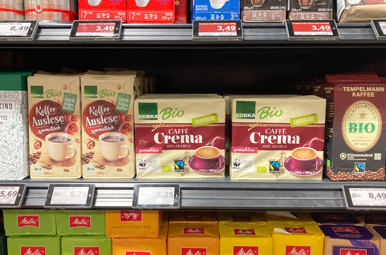 Natürlich hat auch die EDEKA die Bedeutung von Bio früh erkannt und mit „EDEKA Bio“ eine eigene Produktreihe ins Leben gerufen. Die EDEKA beschreibt: „Lebensmittel aus kontrolliert ökologischer Erzeugung schmecken nicht nur hervorragend, sie schonen auch die Natur. Fleisch, Milch und Eier unserer Eigenmarke EDEKA Bio stammen vorwiegend aus regionaler Produktion, bei der das Tierwohl Berücksichtigung findet. Der Anbau von Obst und Gemüse erfolgt nachhaltig und im Einklang mit der Natur. Die Marke erfüllt dabei die Anforderungen der EU-Bio-Verordnung und teilweise die strengeren Kriterien von Anbauverbänden wie Bioland oder Naturland. Viele Produkte tragen zudem den Panda als Zeichen der Partnerschaft mit dem WWF: Ein Zeichen dafür, dass die Produkte von unabhängiger Seite geprüft sind und neben ökologischen Standards auch den länderspezifischen Anforderungen im Hinblick auf die Nachhaltigkeit genügen. Fairtrade-Siegel, mit dem z. B. unser EDEKA Bio Kaffee ausgezeichnet ist, geben außerdem Hinweise über fairen Handel.“