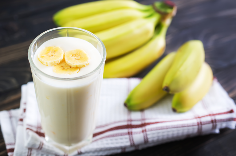 1. 6 EL Vanilleeis und 3 Bananen mit 600 ml Milch in eine Pürierkanne füllen.