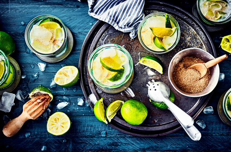 1. 4 Limetten abwaschen, achteln und mit je 2 EL Rohrzucker auf 4 Gläser verteilen.