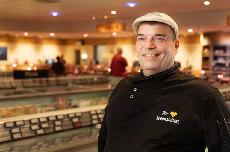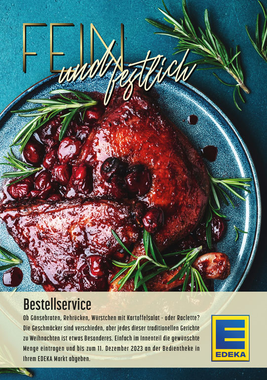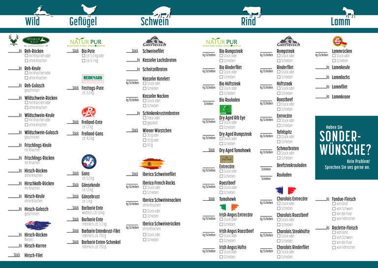 Unser Fleischer Stefan Sbrzesny: „Der Bestellflyer enthält nahezu alles, was sich gut auf der Festtafel macht. Da sind feine Wildspezialitäten zu finden wie Wildschweingulasch, Rehrücken oder Hirschkeule, ganze Gänse und Entenschenkel, aromatisch-saftige Iberico-French-Racks, Rumpsteaks und Entrecote bis zu Rouladen und Fonduefleisch. Sogar Sonderwünsche können Sie hier eintragen. Das bedeutet, hier ist alles möglich – Prime-Cut-Steaks, Schönecke-Geflügel, Wiener Würste, Raclette-Käse, Salate und vieles mehr. Die einzige Ausnahme bildet Hackfleisch, das machen wir direkt vor Ort aus.“